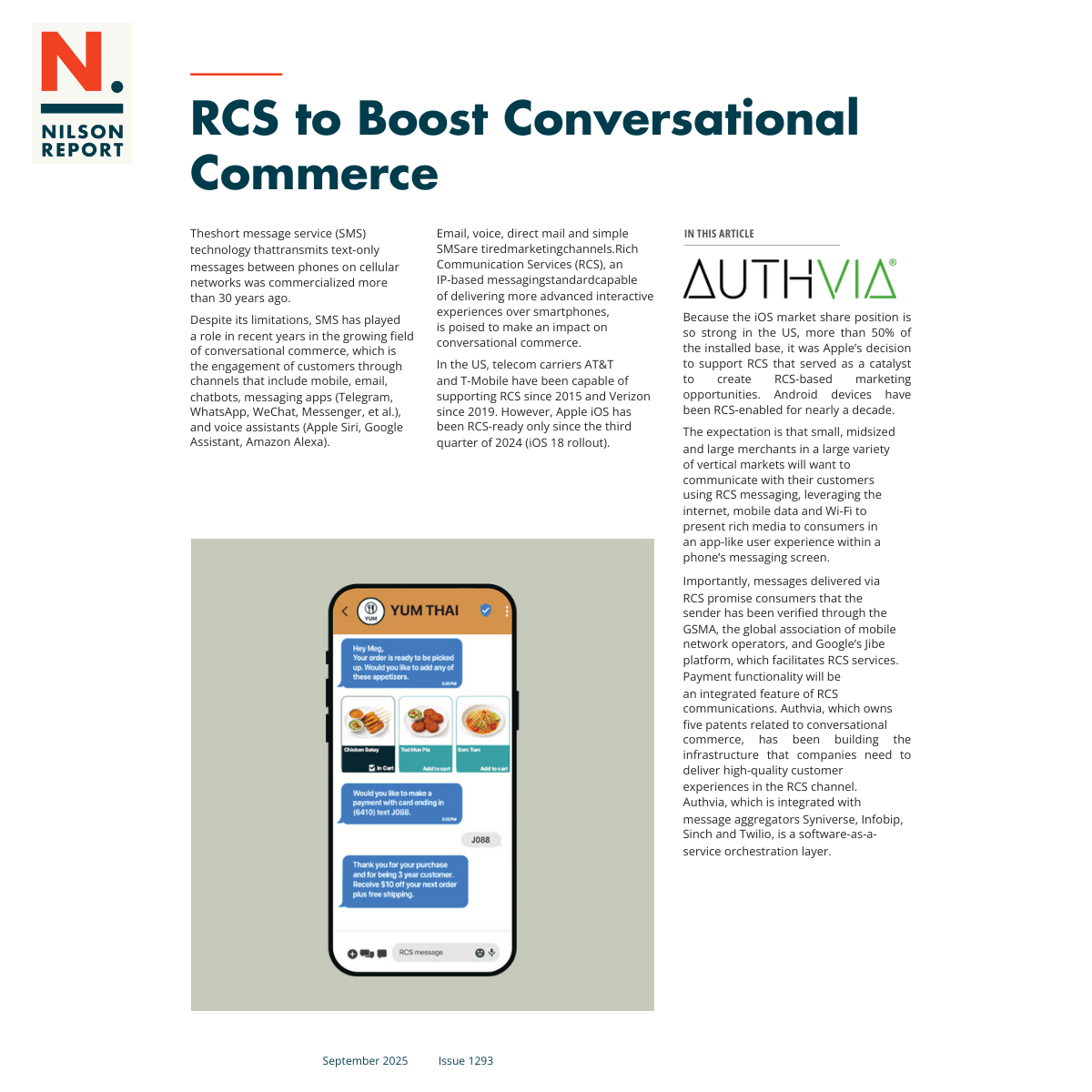 Payment functionality will be an integrated feature of RCS communications. Authvia, which owns five patents related to conversational commerce, has been building the infrastructure that companies need to deliver high-quality customer experiences in the RCS channel.